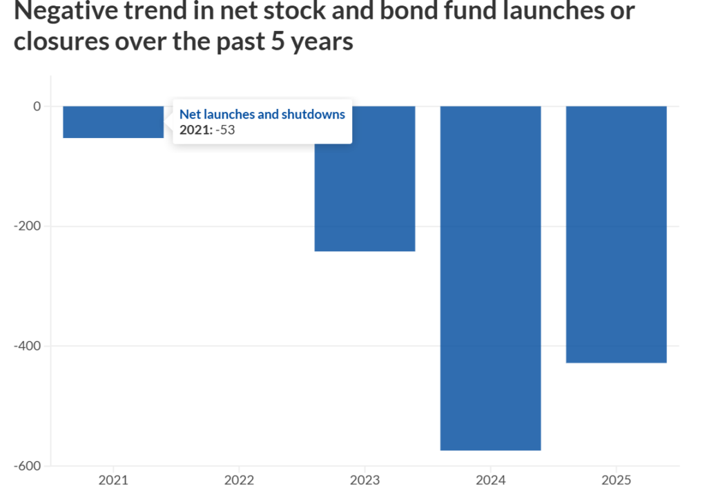 The net losses in the volume of stock and bond funds is approaching levels unseen since the Great Recession. Over a 10-year span ending in early December, the ranks of stock and bond funds plummeted by 1,651, Ptak’s analysis showed. In general, the remaining funds are older, and the newer stock and bonds vehicles’ performance is lower than those with a longer tenure.